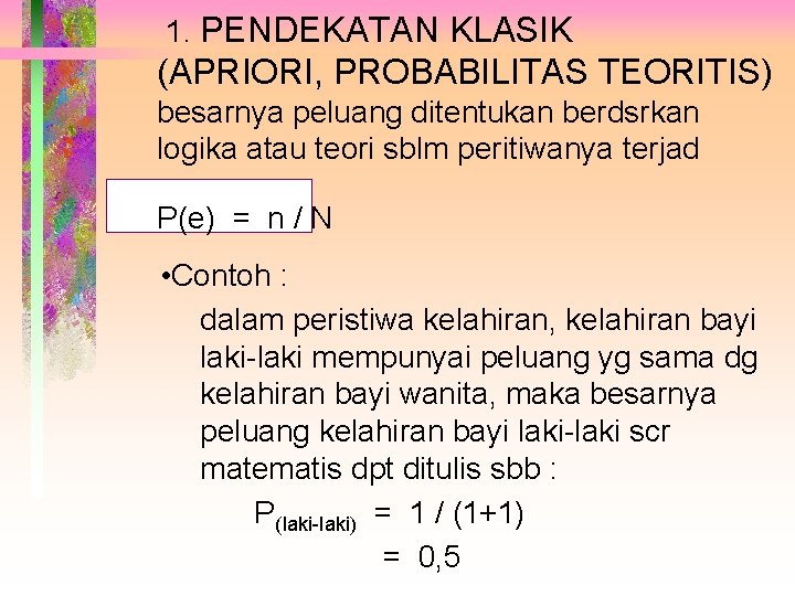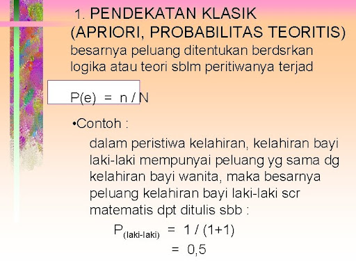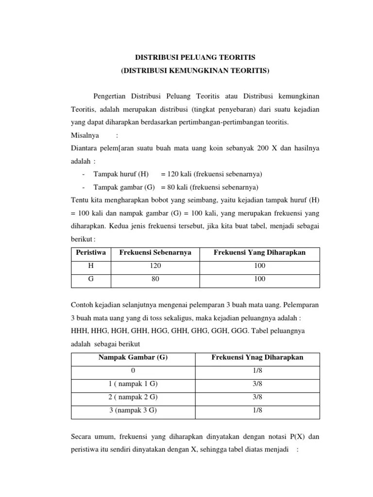 Dedi mengambil suatu koin tanpa melihat . Dalam menentukkan contoh dan bukan contoh peluang, hubungan antara peluang teoritik dan pelu a n g empirik, dan juga siswa masih mengalami kesulitan dalam . Kemungkinan keluarnya angka tertentu pada pelemparan dadu bermata 6 adalah satu contoh dari banyak contoh penerapan materi matematika peluang . Supaya kamu mengerti hubungan antara ruang sampel dengan peluang teoritik, perhatikan beberapa contoh soal berikut. Pada pertandingan sepak bola yang dilaksanakan sebanyak 20 .